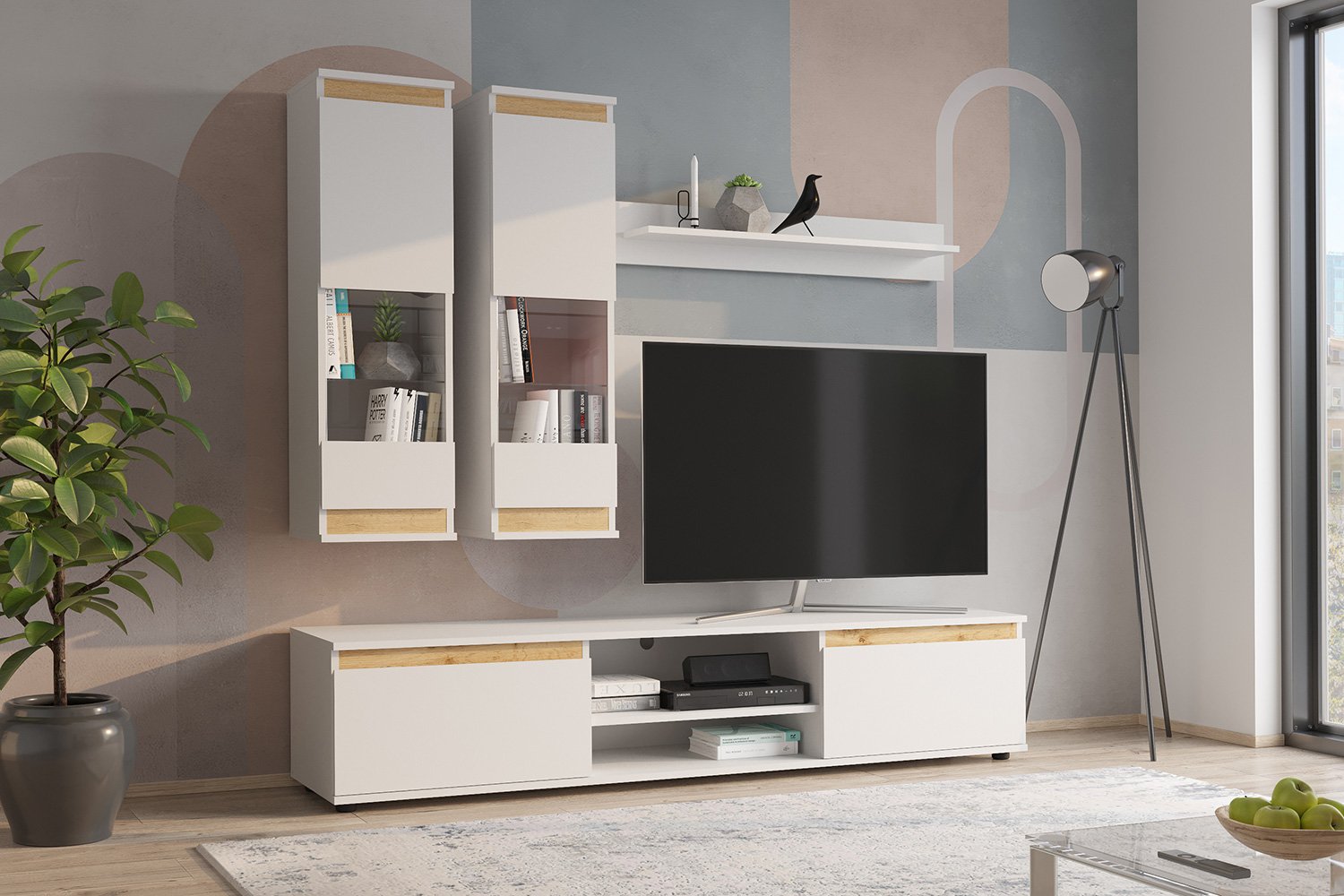 🛋️ Гостиная Bruno – это стильный и функциональный набор мебели, который подойдет для любого интерьера. Каркас выполнен в белом цвете и декорирован дубом Вотан, что придает ему современный вид. Материал фасада – ЛДСП с матовым покрытием, что обеспечивает долговечность и легкость в уходе. Компактные размеры тумбы под ТВ (175x36x37 см) делают ее идеальным решением для небольших пространств.
