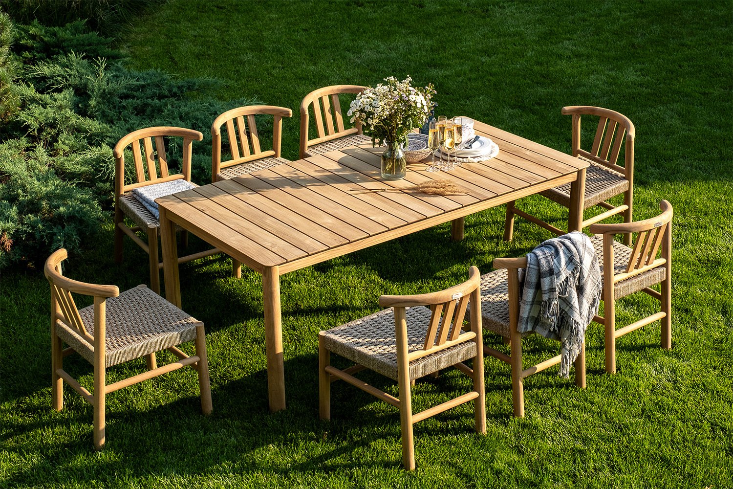 🧺 Верёвочное плетение в бежевом цвете добавляет группе лёгкости и изысканности. Такой элемент дизайна не только украшает мебель, но и обеспечивает дополнительный комфорт при использовании. Плетение гармонично сочетается с натуральным тиковым деревом, создавая уютную атмосферу, которая идеально подходит для семейных ужинов или встреч с друзьями.