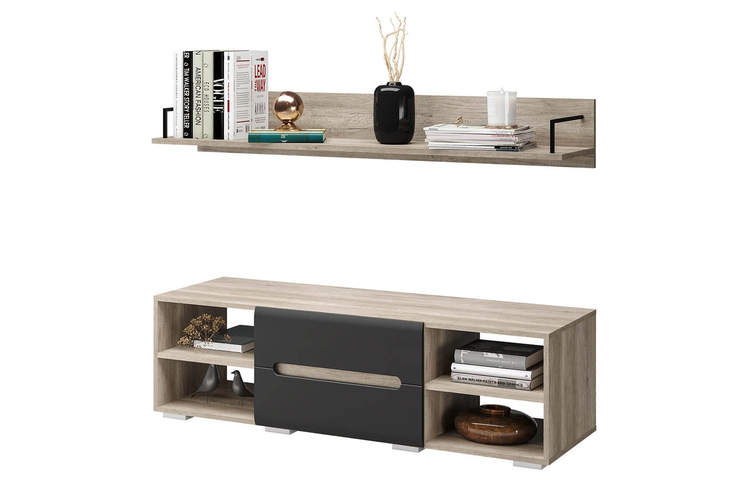 📚 В комплекте с тумбой идет навесная полка, размер которой составляет 130х18,4х27,2 см. Она также выполнена в цвете дуб каньон и выдерживает нагрузку до 15 кг. Это дополнение позволяет организовать пространство и разместить книги, украшения или другие элементы декора, создавая гармоничный и стильный интерьер.