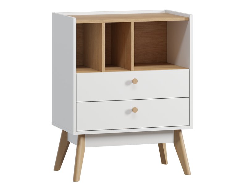 Изготовленный из ЛДСП толщиной 16 мм, этот комод отличается высокой прочностью и долговечностью. 🌿 Декоративные деревянные опоры и массивные ручки добавляют изделию шарма, а фетровые подпятники защищают пол от царапин. Комод включает два вместительных ящика, которые легко открываются благодаря шариковым направляющим, позволяющим выдерживать нагрузку до 5 кг на ящик.