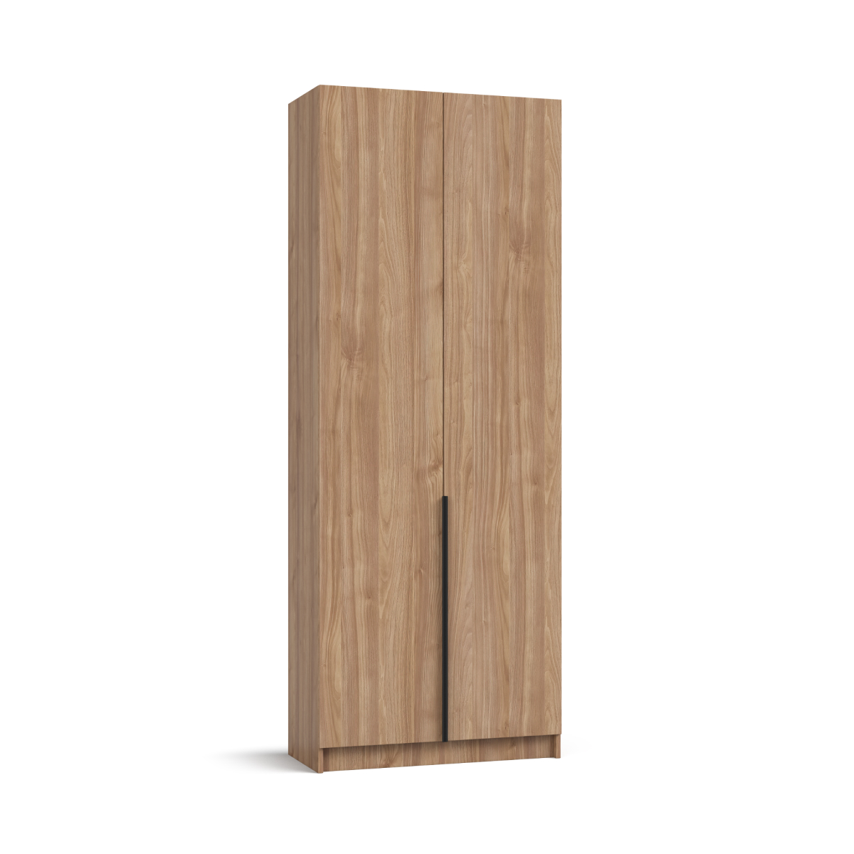 Шкаф имеет два отделения, обеспечивая достаточное количество места для хранения одежды, обуви и других предметов. Внутреннее устройство включает полки и вешалки, что делает его удобным для использования. Размеры 80 см в ширину и 220 см в высоту позволяют разместить шкаф даже в ограниченном пространстве, не теряя при этом функциональности.