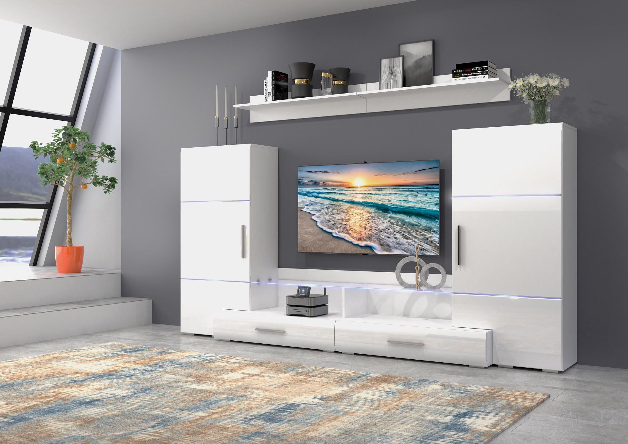 🛋️ Стенка для гостиной Domino сочетает в себе стиль и функциональность. Изготовленная из качественных материалов, таких как ЛДСП и МДФ, она обеспечивает долговечность и современный внешний вид. Гладкая глянцевая поверхность фасадов добавляет нотку элегантности, а белый цвет каркаса позволяет легко вписать ее в любой интерьер.