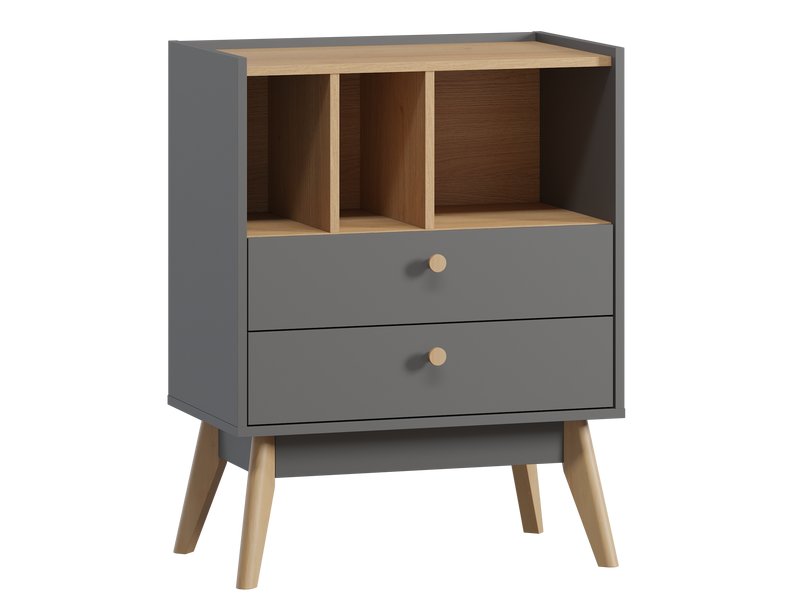 🛠️ Комод оснащён двумя ящиками, каждый из которых выдерживает нагрузку до 5 кг, что делает его идеальным для хранения различных вещей. Ручки выполнены из массива древесины, что добавляет естественности и уюта. Опоры комода выполнены из деревянного массива и имеют фетровые подпятники, что предотвращает повреждения пола.