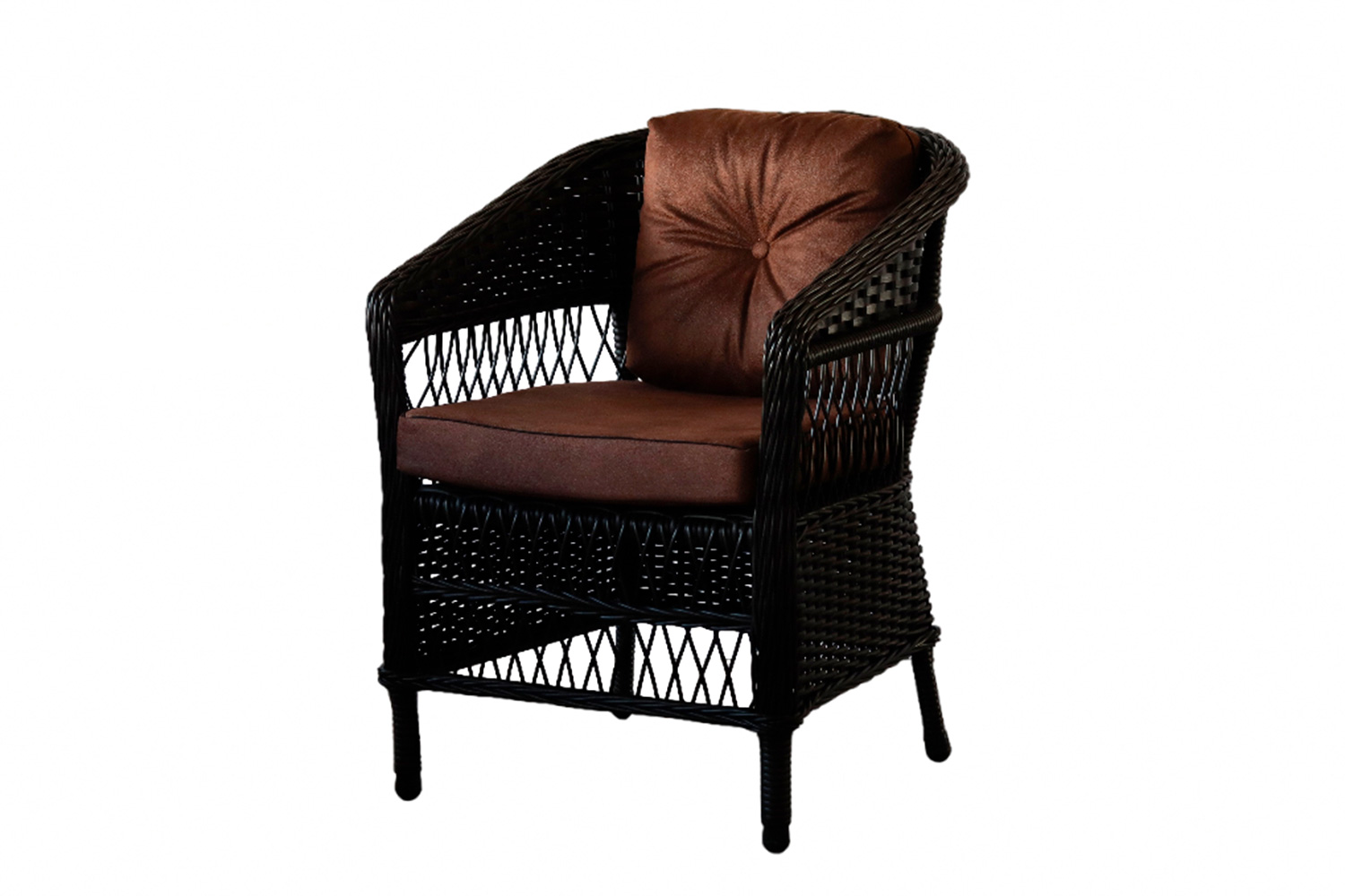 🪑 Каркас кресла выполнен из прочной стали, что гарантирует долговечность и устойчивость. Искусственный ротанг придаёт изделию стильный вид и делает его подходящим для любого интерьера. Цветовая гамма — тёмно-коричневый для отделки и чёрный для каркаса — гармонично сочетается с природой.