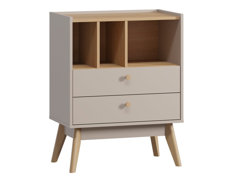 📦 Этот комод имеет два просторных ящика, которые легко открываются благодаря шариковым направляющим. Максимальная нагрузка на один ящик составляет 5 кг, что позволяет удобно хранить различные вещи. Ручки из массива дерева придают изделию дополнительный шарм и делают его более практичным.