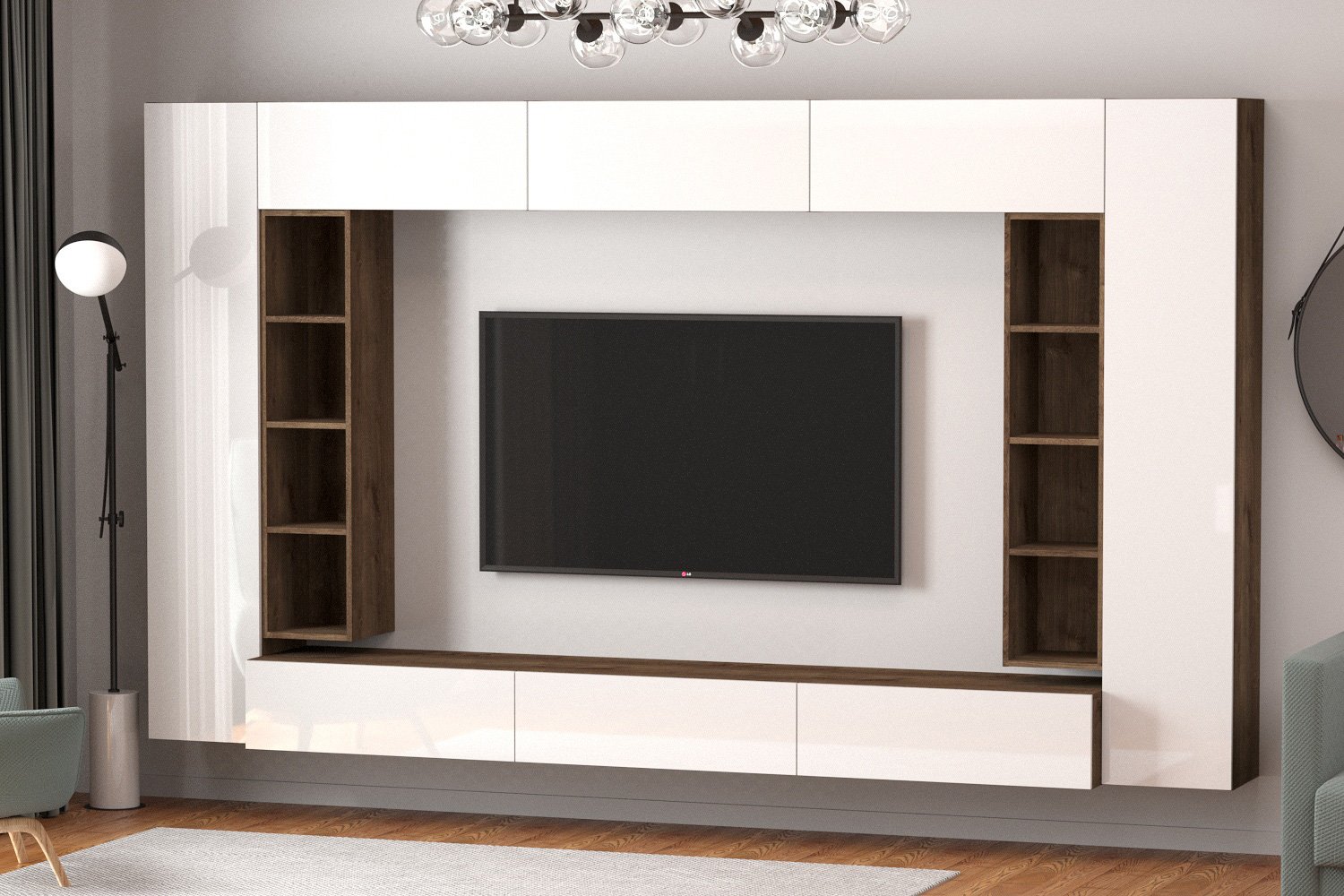 ✨ Особенностью этого набора является его зеркальная сборка, добавляющая визуальную легкость и создающая ощущение простора в комнате. Мебель требует крепления к стене, что обеспечивает дополнительную стабильность и безопасность использования.